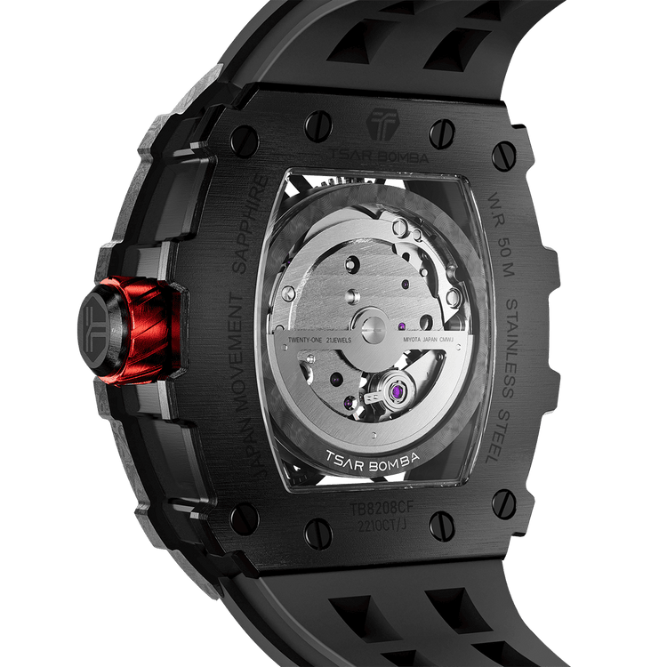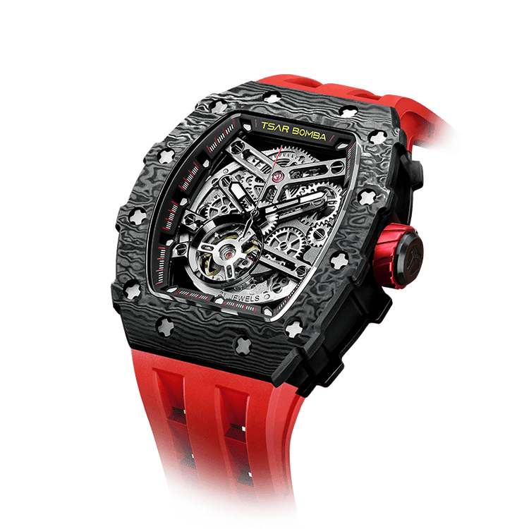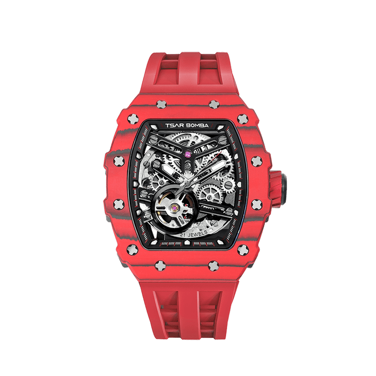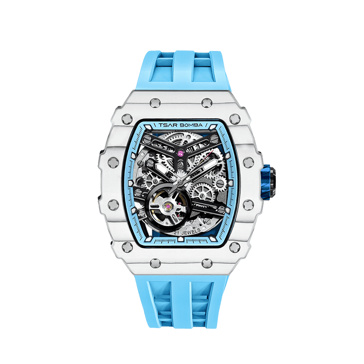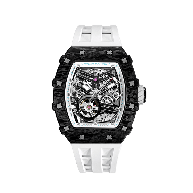The highly flexible silicone strap fits every curve of the wrist, providing a comfortable wearing experience all day long. Its matte texture and streamlined design perfectly blend into the overall mechanical style, showing a balance between sportiness and elegance in the technological era.