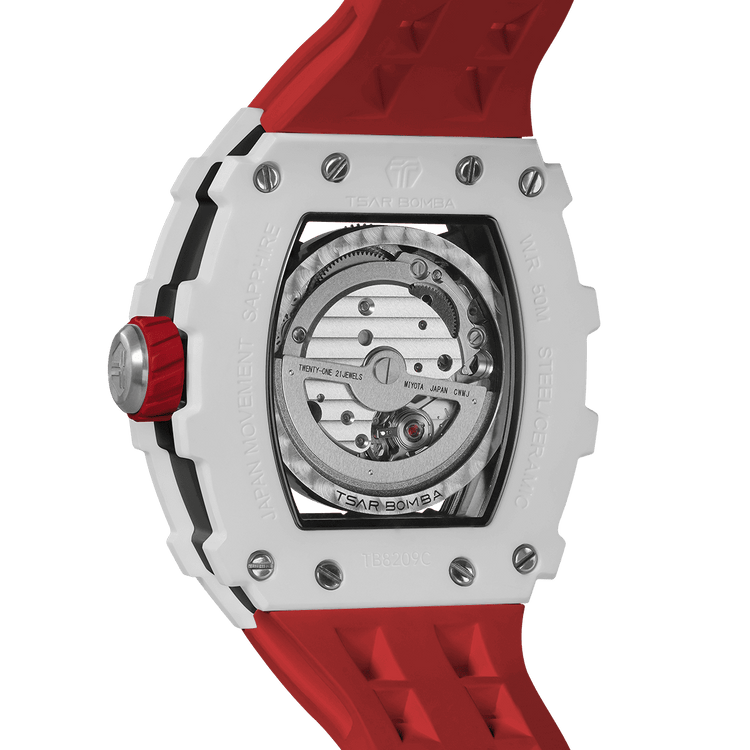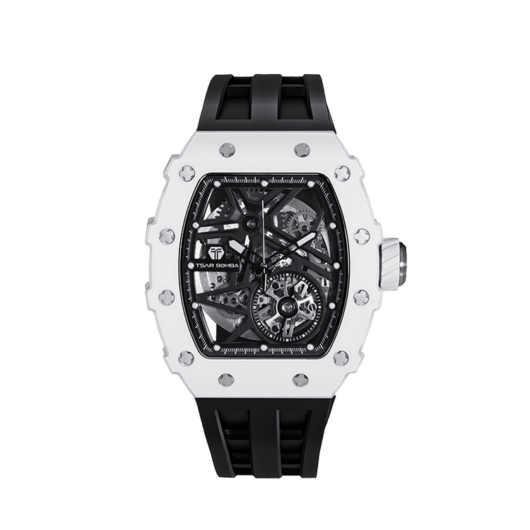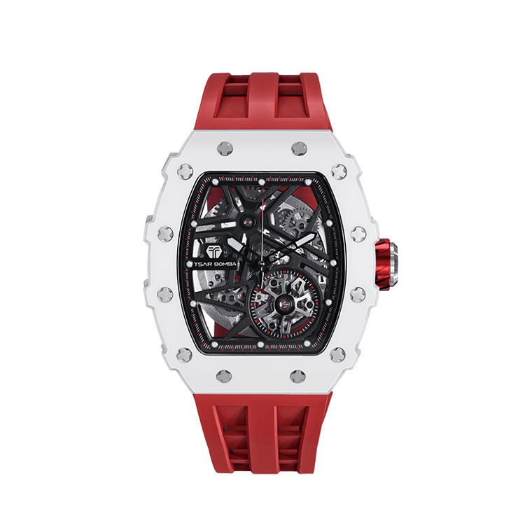 The highly flexible fluororubber strap fits every curve of the wrist, providing a comfortable wearing experience all day long. Its matte texture and streamlined design perfectly blend into the overall mechanical style, showing a balance between sportiness and elegance in the technological era.